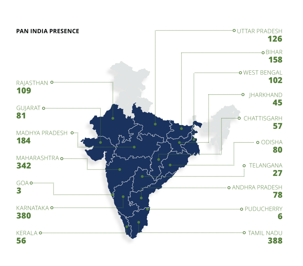 CA Grameen follows a contiguous district-based expansion across rural areas of India. As of 31 December 2025, the company’s footprint spans across 16 states and 1 UT, powered by a network of 2,222 branches with over 21,701 employees, serving more than 44 lakh customers.