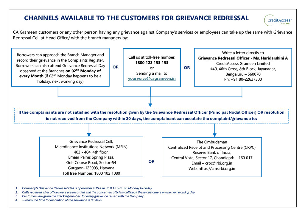 CreditAccess Grameen Limited has established a robust grievance redressal mechanism to systematically monitor its operations in all its areas. We have set-up a dedicated Toll-Free Helpline Number, i.e. 1800 123 153 153, to address any grievances/queries/requests raised by our members. The helpline number is managed by a dedicated Member Support Team (MST) which has team members who are well trained and equipped to handle customer queries and grievances.
